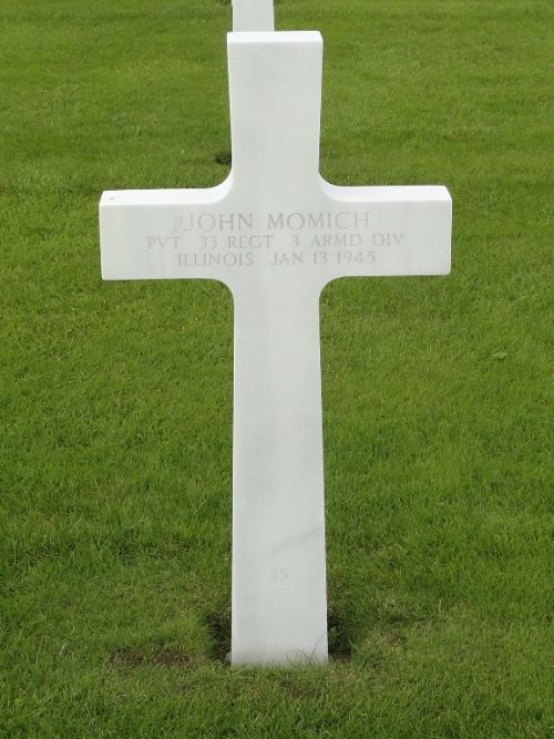 Pvt John Momich was first buried at Temporary American Military Cemetery Henri-Chapelle, Belgium Block EEE, Row 4, Grave 80.Source of information: Peter Schouteten, Carla Mans, www.abmc.gov, www.wwiimemorial.com, www.ancestry.com - Headstone and Interment Record / U.S. WWII Draft Cards Young Men / Cook County, Illinois Marriage Index / 1930 Census