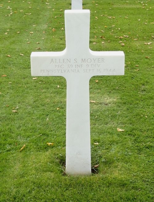 Pfc Allen S. Moyer worked for the Kepner-Scott Shoe Company. He enlisted in Allentown, Pennsylvania on 29 September 1943. He received training at Camp Wheeler, Georgia and Fort Meade, Maryland. He went overseas in March 1944.Pfc Allen S. Moyer was first buried at ther Temporary American Military Cemetery of Fosse, Belgium.