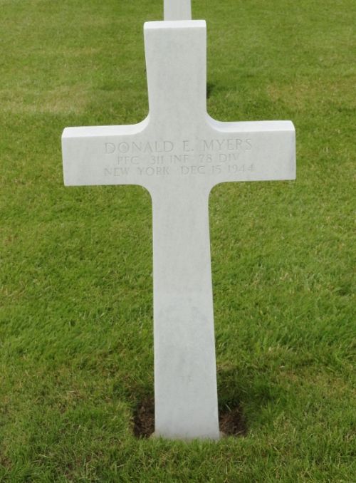 Pfc Donald E. Myers was first buried at Block JJ, Row 2, Grave 30.Source of information: Peter Schouteten, Richard Blunk, Carla Mans, www.abmc.gov, www.wwiimemorial.com, www.ancestry.com - Headstone and Interment Record / 1925 Census / 1930 Census