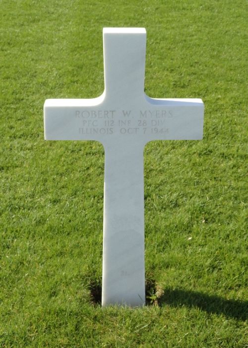 "In grateful memory of Pfc. Robert W. Myers, A. S. No. 36367029, who died in the service of his country in the European area October &. 1944. He stands in an unbroken line of patriots who have dared to die that freedoom might live and grow and increase its blessings. Freedom lives and through it he lives in a way that humbles the undertakings of most men."