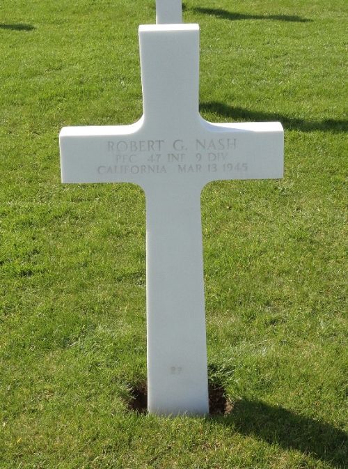 Pfc Robert G. Nash worked on a farm before he enlisted in San Francisco, California on 28 December 1943.Source of information: Peter Schouteten, Carla Mans, www.abmc.gov, www.wwiimemorial.com, www.archives.gov - WWII Enlistment Record, www.ancestry.com - Headstone and Interment Records / U.S. WWII Draft Cards Young Men / 1930 Census, http://9thinfantrydivision.com