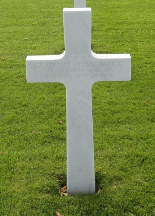 Pvt Clarence R. Neumann was first buried at Temporary American Military Cemetery Henri-Chapelle, Belgium Block U, Row 1, Grave 19.Source of information: Peter Schouteten, Carla Mans, www.abmc.gov, www.wwiimemorial.com, www.ancestry.com - Headstone and Interment Record / 1930 Census