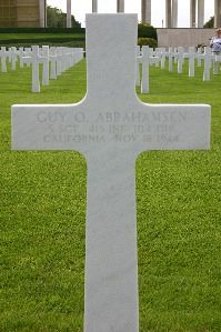S/Sgt Guy O. Abrahamsen enlisted in San Francisco, California on 7 April 1943.Per letter from Chaplain Quinn: "At the time of your husband’s death we were in a city here in Germany, holding part of it, while the Germans held the rest. It was an important city and its complete capture was a step toward bringing this dreadful war to an end a little sooner. He was in a group that advanced toward a pillbox in a field where he fell. His comrades went to his side at once, but there was nothing to be done. Death had been merciful in this – it was instantaneous and Guy did not suffer. He comrades say that once he fell he did not move again.