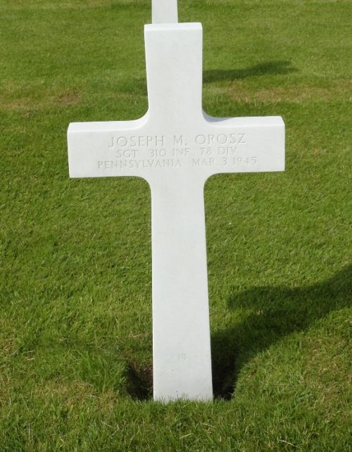 Sgt Joseph M. Orosz enlisted on 11 June 1941 and was sent overseas in January 1945.Source of information: Terry Hirsch, Carla Mans, www.abmc.gov, www.ancestry.com - 1930 Census / Headstone and Interment Record / U.S. WWII Draft Cards Young Men, www.fold3.com, www.findagrave.com - James L. Cooper, Richard Blunk, www.wwiimemorial.com