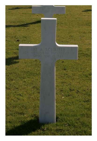 A returning eye-witness account stated that this aircraft had come under attack by single enemy fighters, tad on and that 6 parachutes were seen immediately thereafter. No other details were given in this MACR concerning friendly force accounts about this aircrew. A German report #KU1834 did shed some light on the crew's fate following the fighters attacks: that this plane was shot down by a fighter near Hessen, 21 miles northwest of Wernigerode and that had exploded in mid-air.Sgt Schaefer was first buried at the Temporary American Military Cemetery of Margraten, The Netherlands.