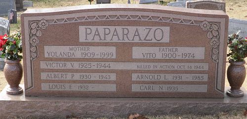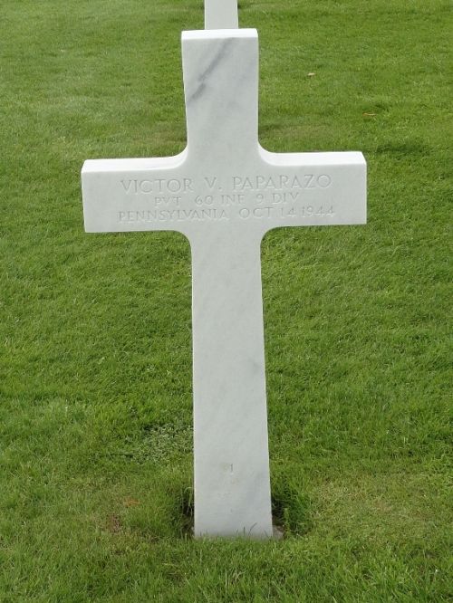 Pvt Victor V. Paparazo enlisted in New Cumberland, Pennsylvania on 28 March 1944.Pvt Victor V. Paparazo is remembered at the Saint Joseph Mount Carbon Cemetery, North Manheim, Pennsylvania.