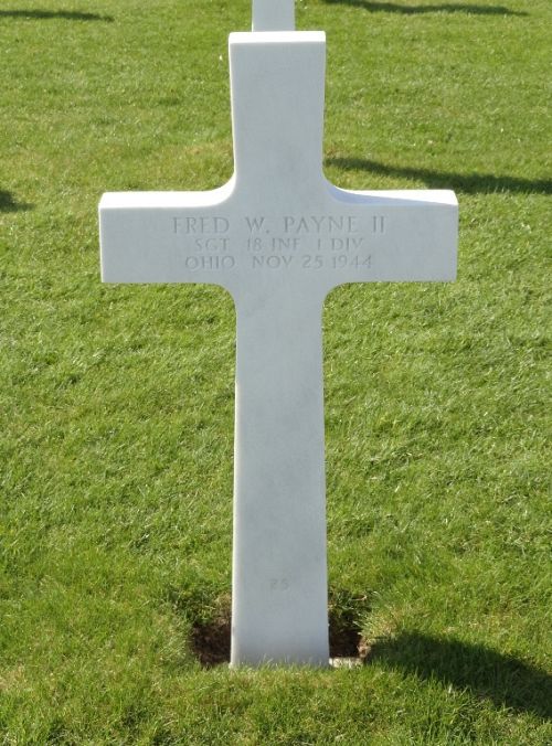 Sgt Fred W. Payne II was first buried at Temporary American Military Cemetery Henri-Chapelle, Belgium Block K, Row 1, Grave 18.