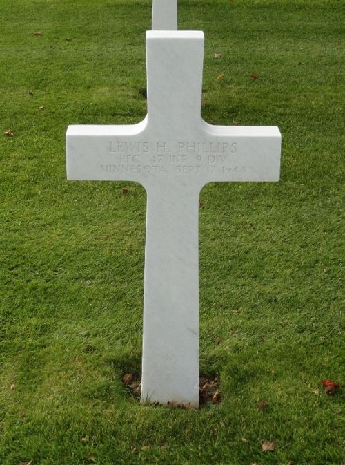 Pfc Lewis H. Phillips was first buried at the Temporary American Military Cemetery of Fosse, Belgium.Source of information: Peter Schouteten, Carla Mans, www.abmc.gov, www.wwiimemorial.com, www.ancestry.com - Headstone and Interment Record / U.S. WWII Draft Cards Young Men, http://9thinfantrydivision.net