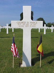 Pvt George D. Pierce enlisted in Brewer, Maine on 25 November 1940.His initial burial took place on Fosse Cemetery, Namur, Belgium.