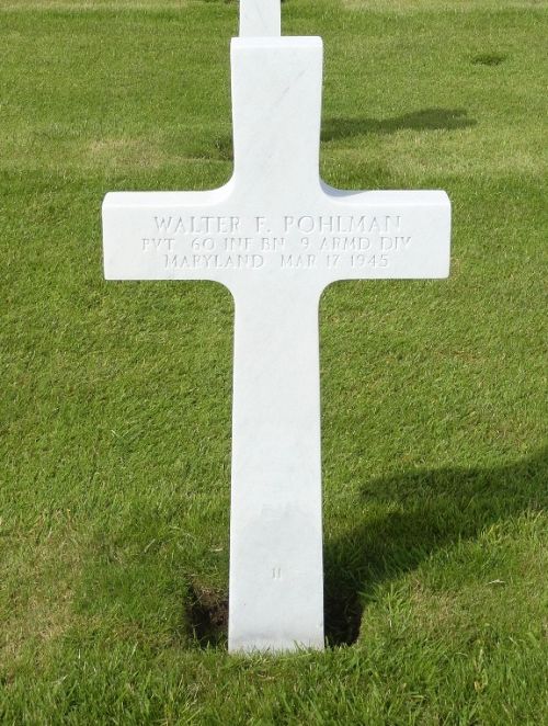 Pvt Walter F. Pohlman was first buried at Temporary American Military Cemetery Henri-Chapelle, Belgium Block H-4, Row 10, Grave 183.