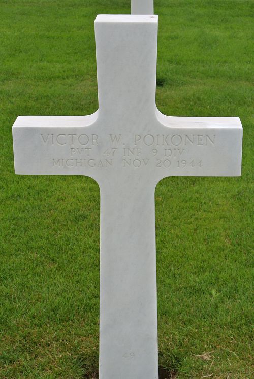 Pvt Victor W. Poikonen was a driver before he enlisted in Kalamazoo, Michigan on 6 April 1943.Source of information: Peter Schouteten, Carla Mans, www.abmc.gov, www.wwiimemorial.com, www.archives.gov - WWII Enlistment Record, www.ancestry.com - Headstone and Interment Record / U.S. WWII Draft Cards Young Men, http://9thinfantrydivision.net
