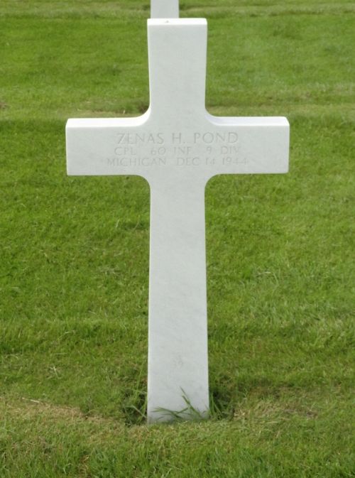 Cpl Zenas H. Pond graduated from Central High School and was employed by Oldsmobile before he enlisted in Kalamazoo, Michigan on 20 October 1942. He trained at Camp Wolters, Texas; Fort Benning, Georgia; Miami Beach, Florida and Fort Meade, Maryland. He was sent overseas in September 1944.Source of information: Peter Schouteten, www.abmc.gov, www.wwiimemorial.com, www.archives.gov - WWII Enlistment Record, www.ancestry.com - Headstone and Interment Record / 1930/1940 Census, http://9thinfantrydivision.net, Lansing State Journal 23 January 1945