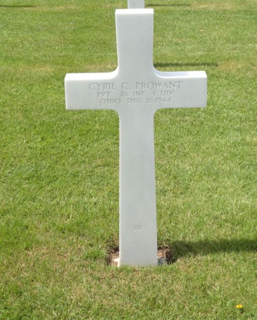 Pfc Cyril C. Prowant was first buried at Temporary American Military Cemetery Henri-Chapelle Block PP, Row 9, Grave 161.