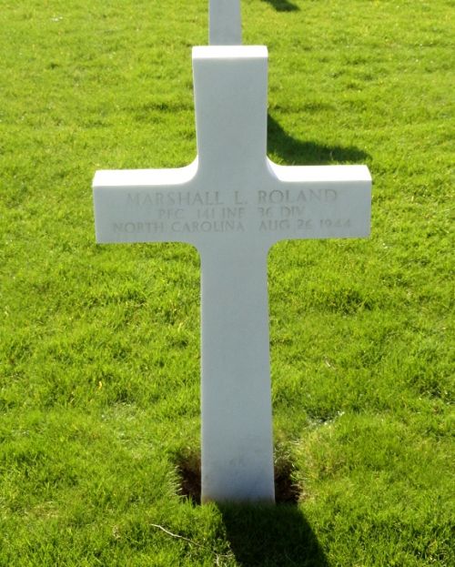 Pfc Marshall L. Roland enlisted at Camp Croft, South Carolina on 20 August 1943.He was first buried at the Temporary American Military Cemetery of Draguignan, France.