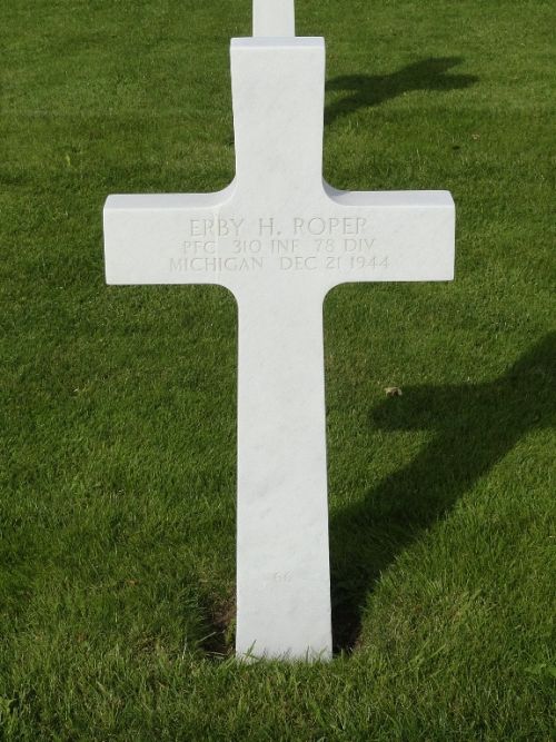 Pfc Erby H. Roper was a driver for Stalkamp Brothers of Zeeland, Michigan before he enlisted in Kalamazoo, Michigan on 25 March 1943.Source of information: Peter Schouteten, Susan Linton - Grand Rapids Press 4 January 1945, www.abmc.gov, www.findagrave.com - James L. Cooper / Richard Blunk, www.wwiimemorial.com, www.archives.gov - WWII Enlistment Record, www.ancestry.com - Headstone and Interment Records / Lull Allen Family Tree / McGillivray Reynolds Family Tree