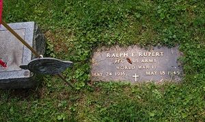Pfc Ralph E. Rupert enlisted in Altoona, Pennsylvania on 25 May 1942.He is remembered at the Shelocta Presbyterian Cemetery, Indiana County, Pennsylvania. The date of death on this stone is wrong.