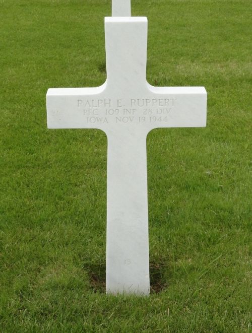 Pfc Ralph E. Ruppert graduated from Iowa City High Schooland attended the University of Iowa for one year. He worked at the local post office.He enlisted at Camp Dodge, Iowa on 16 January 1944 and was sent overseas in August 1944.