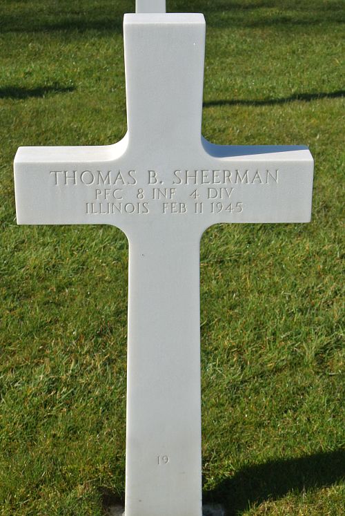 Pfc Thomas B. Sheerman was first buried at Temporary American Military Cemetery Foy, Belgium.Source of information: Danny van der Groen, Peter Schouteten, www.abmc.gov, www.wwiimemorial.com, www.ancestry.com - Headstone and Interment Record / Mercer Family Tree
