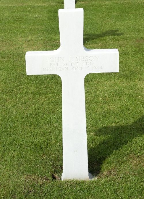 Pvt John J. Sibson was first buried at Temporary American Military Cemetery Henri-Chapelle, Belgium Block Plot V, Row 4, Grave 65.Source of information: Raf Dyckmans, Terry Hirsch, www.abmc.gov, www.wwiimemorial.com, www.archives.gov - WWII Enlistment Record, www.ancestry.com - various family trees / U.S., Headstone and Interment Record