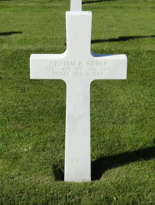 Pfc William B. Sieber was first buried at Temporary American Military Cemetery Foy, Belgium Block B, Row 5, Grave 114.Source of information: Peter Schouteten, Carla Mans, www.abmc.gov, www.wwiimemorial.com, www.ancestry.com - Headstone and Interment Record / U.S. WWII Draft Cards Young Men / 1940 Census, http://106thinfdivassn.org