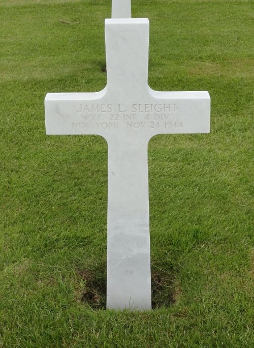 Pvt James L. Sleight was a carpenter before he enlisted at Fort Dix, New Jersey on 15 March 1944.Source of information: Danny van der Groen, Peter Schouteten, www.abmc.gov, www.wwiimemorial.com, www.archives.gov - WWII Enlistment Record, www.ancestry.com - U.S. Headstone and Interment Records for U.S. Military Cemeteries on Foreign Soil / City Hall Family Tree / 1940 Census