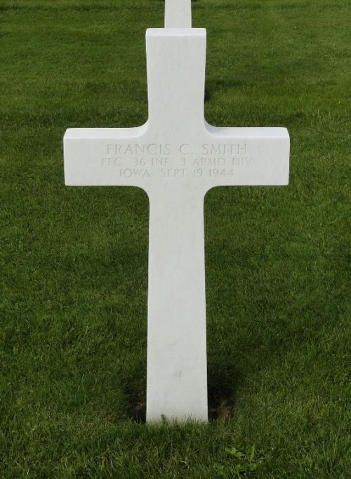 Pfc Francis C. Smith lived with his parents on a farm near Garber, Iowa until their death in 1939. He attended the Colesburg en Guttenberg schools. He volunteered for service in the Army on June 27, 1941. He received his basic training at Camp Polk, La., and then was transferred to Rice, Calif., for desert training. From there he was moved to Camp Pickett, Va., for a short time and was then stationed at Indiantown Gap, Pa., from where he had his last furlough in July of 1943. He was shipped overseas to England the following month and from there went into France and his last letter home was written somewhere in Belgium, Sept 11.Source of information: Peter Schouteten, Sharyl Ferrall, www.abmc.gov, www.wwiimemorial.com, www.ancestry.com - U.S., Headstone and Interment Records for U.S. Military Cemeteries on Foreign Soil / 1930 Census, http://iagenweb.org/boards/clayton/obituaries/index.cgi?read=593899