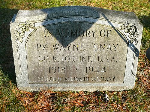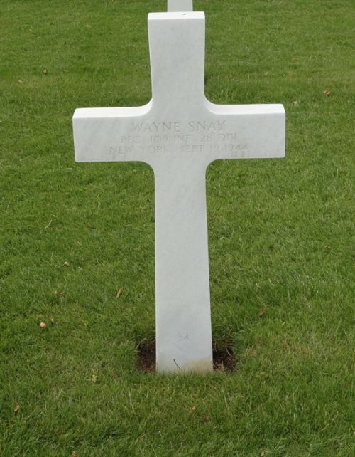 Pfc Wayne Snay enlisted in Buffalo, New York on 18 April 1941. He was sent overseas in September 1943 and last was heard from by his family in France in a letter dated 31 August 1944.He was first buried at the Temporary American Military Cemetery of Fosse, Belgium.