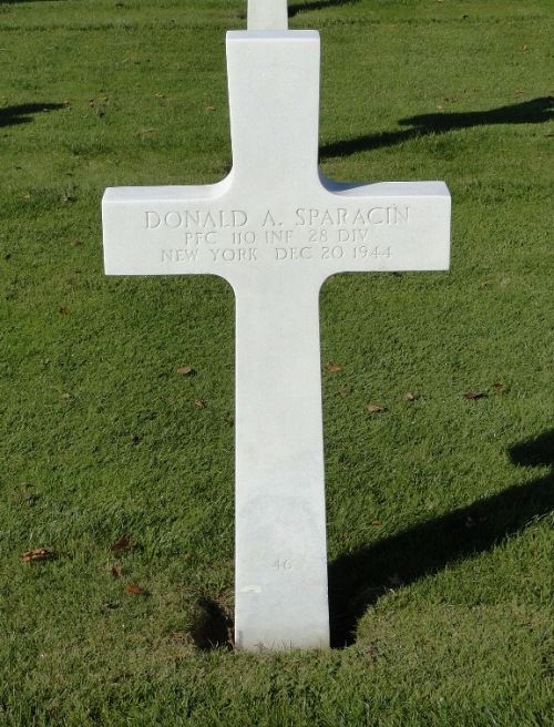 Pfc Donald A. Sparacin graduated from Eastchester High School in 1941 and attended Penn State College.Source of information: André Koch, www.abmc.gov, www.wwiimemorial.com, www.ancestry.com - 1930 Census / U.S., Headstone and Interment Records for U.S. Military Cemeteries on Foreign Soil, https://www.ibiblio.org/hyperwar/USA/USA-SS-Three/USA-SS-Three-III-8.html