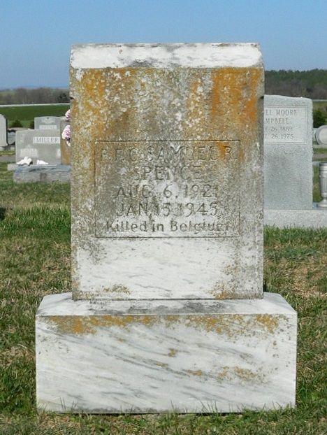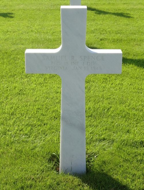 Pfc Samuel R. Spence was first buried at Temporary American Military Cemetery Henri-Chapelle, Block GGG, Row 7, Grave 133.He is remembered at Mount Jackson Cemetery in Mount Jackson, Shenandoah County, Virginia.