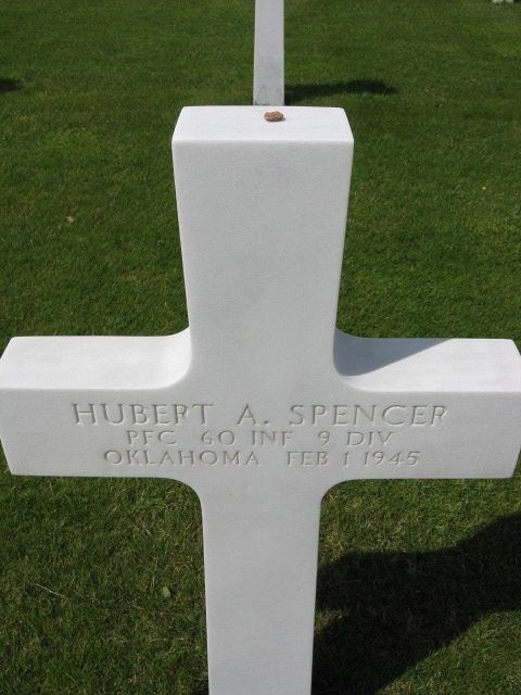 Pfc Hubert A. Spencer attended college and was a laboratory technician and assistant before he enlisted at Fort Sill, Oklahoma on 21 June 1944.Source of information: Peter Schouteten, Sheree Dowdle, www.abmc.gov, www.wwiimemorial.com, www.archives.gov - WWII Enlistment Record, www.ancestry.com - Headstone and Interment Record / 1930 Census / U.S. WWII Draft Cards Young Men, http://9thinfantrydivision.net