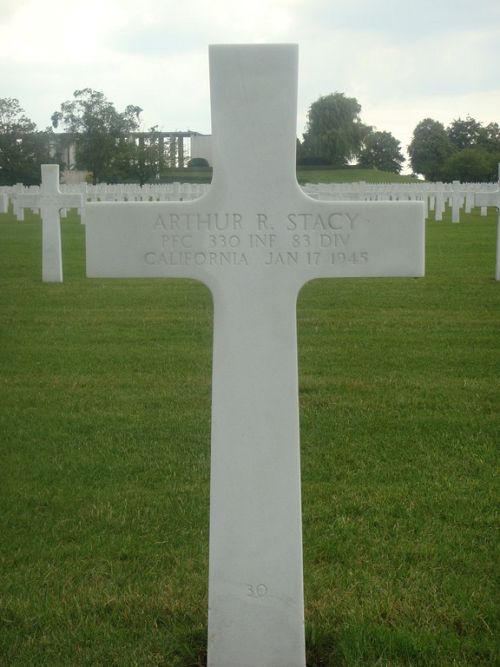 Pfc Arthur R. Stacy worked in the production of fruit and cotton.He was first buried at the Temporary American Military Cemetery of Foy, Belgium.