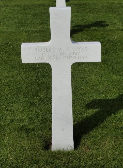 Pvt Robert W. Stamas worked in an aircraft factory before he enlisted at Fort MacArthur, San Pedro, California on 31 March 1944.His father was born in Greece.
