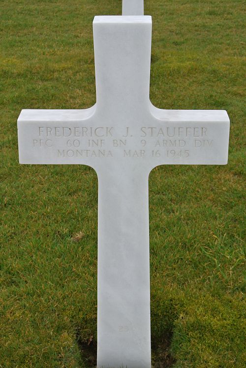 Pfc Frederick J. Stauffer was employed at the Milwaukee Railroad in Harlowton.He enlisted at Fort Douglas, Utah on 22 June 1944 and received his training at Fort McClellan, Alabama. He was send overseas in December 1944.
