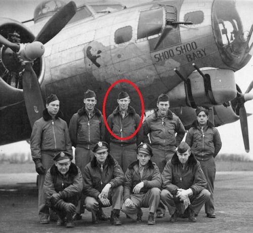 The airplane was on its 110th mission without aborting and was hit by flak north of Brux. The No. 2 engine was smoking and was feathered. Bombs were dropped on the third bomb run and the target was crossed with the formation. It then slipped off to the left and exploded in the air approximately three minutes after it started descending. Six parachutes were seen. The first three came out together, then three a bit later. One jump was delayed. The men in the rear of the B-17 went out the waist hatch. Sgt. Melvin C. Carlson jumped first, followed by Sgts. Walter E. Smith and Luis L. Contreras. Other crewmen jumped from the nose hatch. Sgt. Contreras landed separately from the rest of his crew, sought shelter and was captured by angry civilians. He witnessed an unknown airman being shot by the civilians, was beaten and abused and placed in a city jail for four days.