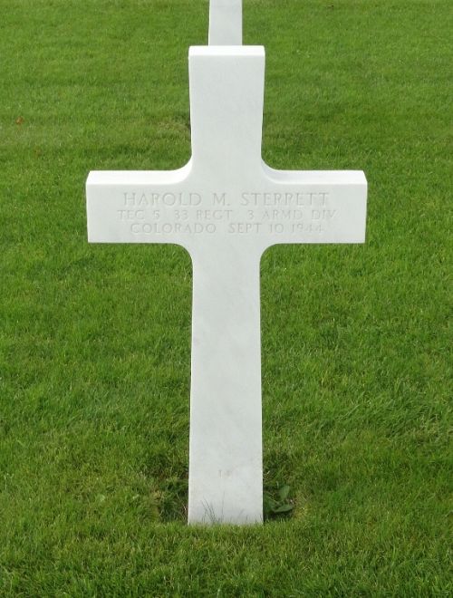 T/5 Harold M. Sterrett was first buried at the Temporary American Military Cemetery of Fosse, Belgium at Block A, Row 9, Grave 180.