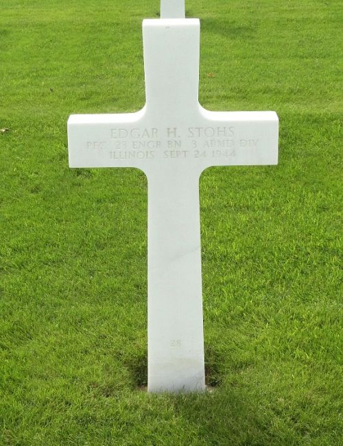 Pfc Edgar H. Stohs was first buried at Temporary American Military Cemetery Henri-Chapelle, Belgium Block EE, Row 4, Grave 69.Source of information: Peter Schouteten, Carla Mans, www.abmc.gov, www.wwiimemorial.com, www.ancestry.com - Headstone and Interment Record / U.S. WWII Draft Cards Young Men / 1920/1940 Census