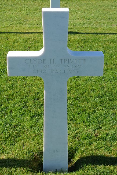 1st Lt Clyde H. Trivett was first buried at Block XXX, Row 8, Grave 157.Source of information: Peter Schouteten, Sheree Dowdle, www.abmc.gov, www.findagrave.com - James L. Cooper, Richard Blunk, www.wwiimemorial.com, www.ancestry.com - Headstone and Interment Record / Rawlings Family Tree