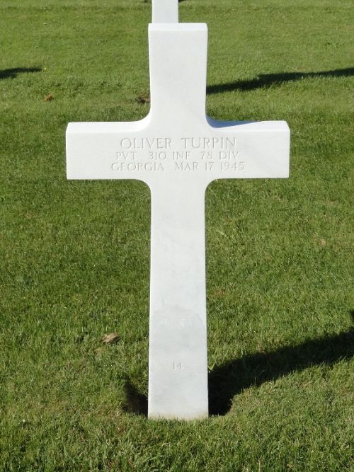 Pvt Oliver Turpin enlisted at Fort Benning, Georgia on 27 October 1942.Source of information: Peter Schouteten, www.abmc.gov, www.findagrave.com – Richard Blunk, www.wwiimemorial.com, www.archives.gov – WWII Enlistment Record, www.ancestry.com - U.S., Headstone and Interment Records for U.S. Military Cemeteries on Foreign Soil / U.S. WWII Draft Cards Young Men / Alabama, WWII Military Dead and Wounded