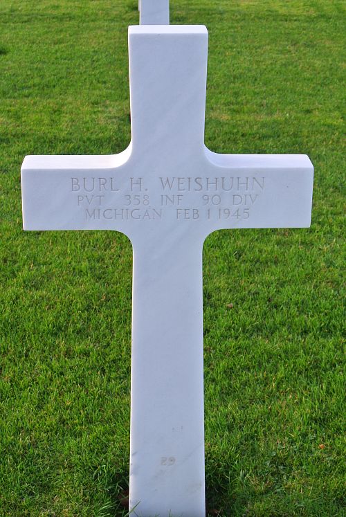 Pvt Burl H. Weishuhn was employed at the Wilson Foundry and Machine Company before he enlisted at Fort Sheridan, Illinois on 17 July 1944. He was sent overseas in January 1945.He was first buried at the Temporary American Military Cemetery of Foy, Belgium.