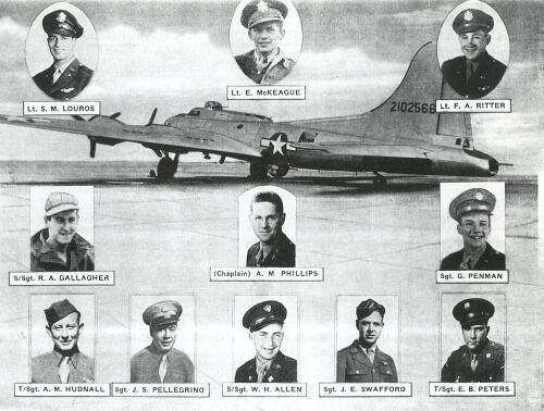 Besides Sgt Penman, S/Sgt Robert Gallagher, the right waist gunner and the pilot, 2nd Lt Edward Mc Keague were rescued by a mine sweeper. Lt Mc Keague died a few days later from shock and exposure. The remains of the other seven crew members are still missing. T/Sgt William Allen, S/Sgt James L. Swafford and Sgt Joseph S. Pellegrino are listed on the Tablets of the Missing at Ardennes Cemetery. 2nd Lt Frank A. Ritter, 2n Lt Stelios Louros, S/Sgt Evan B. Peters and S/Sgt Alfred M. Hudnall are listed on the Tablets of the Missing at Cambridge American Military Cemetery.