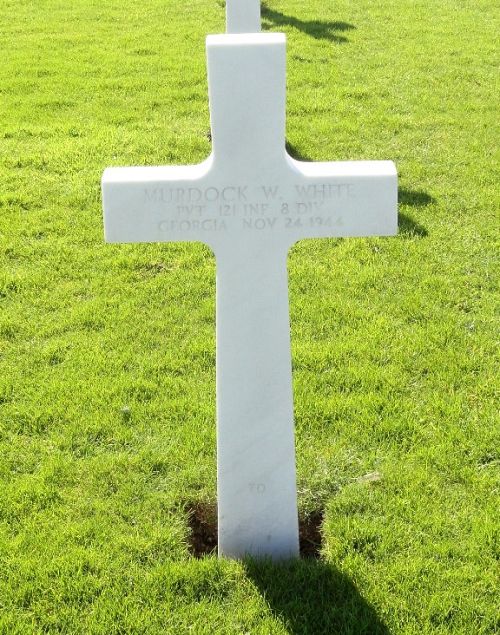 Pvt Murdock W. White worked on a farm before he enlisted at Fort McPherson, Georgia on 10 December 1943.Source of information: Raf Dyckmans, www.abmc.gov, www.wwiimemorial.com, www.archives.gov - WWII Enlistment Record, www.ancestry.com - various family trees / U.S., Headstone and Interment Records for U.S. Military Cemeteries on Foreign Soil, 1942-1949, http://cgsc.contentdm.oclc.org - History of the 121st Infantry Regiment, After Action Report of the 121st Infantry Regiment