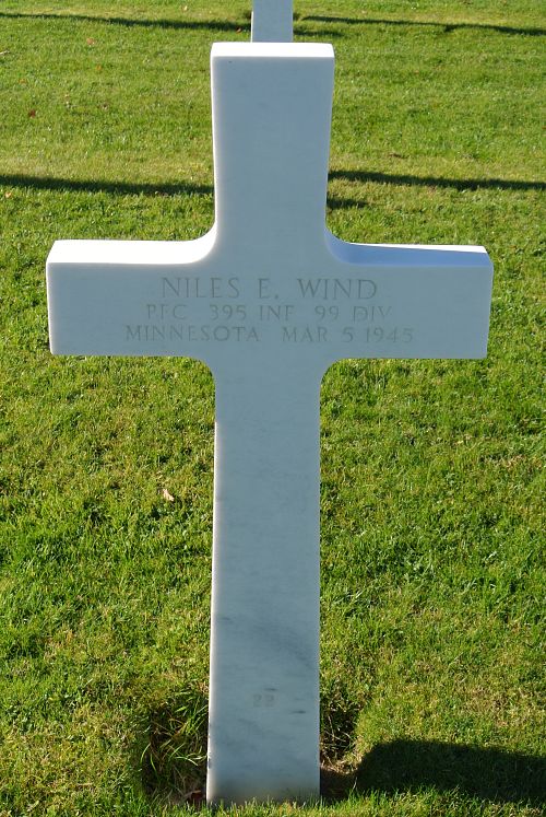 Pfc Niles E. Wind was a driver before he enlisted at Fort Snelling, Minnesota on 10 September 1943.Source of information: Peter Schouteten, www.abmc.gov, www.wwiimemorial.com, www.archives.gov – WWII Enlistment Record, www.ancestry.com - U.S., Headstone and Interment Records for U.S. Military Cemeteries on Foreign Soil / Thompson White Family History