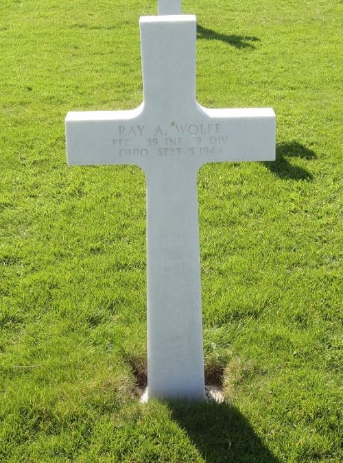 Pfc Ray A. Wolfe was a baker before he enlisted at Fort Hayes, Ohio on 5 September 1940.He was first buried at the Temporary American Military Cemetery of Fosse, Belgium.