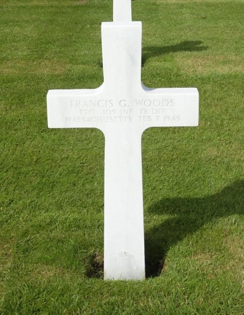 Pfc Francis G. Woods enlisted at Fort Devens, Massachusetts on 6 April 1944.Source of information: Peter Schouteten, Richard Blunk, Carla Mans, www.abmc.gov, www.wwiimemorial.com, www.findagrave.com - James L. Cooper, www.archives.gov - WWII Enlistment Record, www.ancestry.com - Headstone and Interment Record / U.S. WWII Draft Cards Young Men / 1930/1940 Census