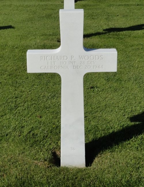 1st Lt Richard P. Woods graduated from the University of California. He was a member of the R.O.T.C.He was first buried at the Temporary American Military Cemetery in Foy, Belgium.