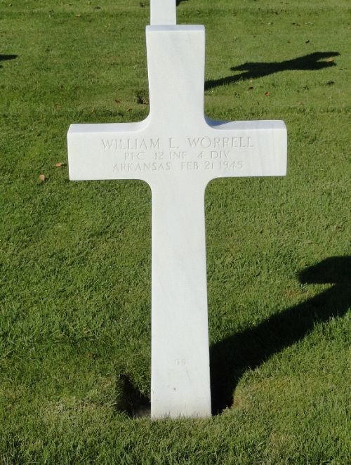 Pfc William L. Worrell was first buried at Temporary American Military Cemetery Foy, Belgium.Source of information: Danny van der Groen, Peter Schouteten, www.abmc.gov, www.wwiimemorial.com, www.ancestry.com - U.S., Headstone and Interment Records for U.S. Military Cemeteries on Foreign Soil / 1930 Census / Arkansas, County Marriages Index