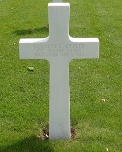 He was awarded the Bronze Star Medal posthumously. The citation cited: Pfc Vernon L. Etzler was a scout of Co. F, 355th Regiment, 89th Infantry Division, when his unit was immobilized by heavy enemy automaticweapons fire near Grafenhain, Germany. Voluntarily exposing himself to enemy fire, Etzler ran across an open field until he reached an advantageous firing position. His fire from this position killed one German and forced others to withdraw, permitting his squad to successfully continue its attack. As he was returning to his comrades, he was killed by enemy fire from the town.