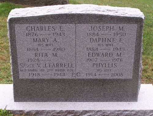 S/Sgt Vincent J. Farrell enlisted in New York City, New York on 22 January 1941. He was an elevator operator before he enlisted.S/Sgt Farrell is remembered at the Saint Francis de Sales Cemetery in Elka Park, Greene County, New York on a family memorial marker.
