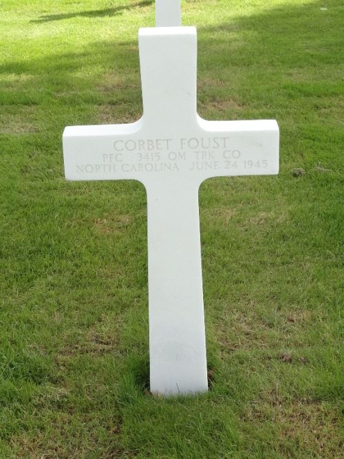 Pfc Corbet Foust Jr. was employed as a porter at the Southern Railway station before he enlisted in June 1944. He was sent overseas in November 1944.According to a newspaper article, Pfc Foust drowned. No further details are known.