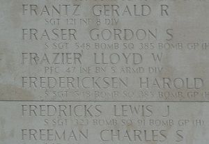 Pfc Lloyd W. Frazierenlisted in March 1942, and was sent overseas in February 1944.His mission was to attack Bergstein, Germany. When the objective was gained, tank and small arms fire were encountered during the assault. A check of the squad was made and showed that Pfc Frazier was missing. He was last seen walking with the third squad of the anti-tank platoon in the direction of Bergstein, Germany.